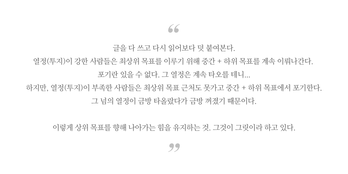 최상단의 상위 목표를 이루고 희열을 느끼기보다는 자잘한 하위목표를 이루고 만족해왔다.