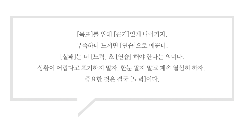 마지막으로 좋을때도 어려울때도 의심이 들때도 계속 앞으로 나아가려면 처음부터 끝까지 할 수 있다는 [희망]을 유지해야 한다. 쉬어갈 수는 있지만, 포기는 하지 않는다.