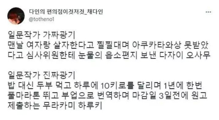 [인간 실격]이라는 대표작을 갖고 있으며 역시 유명한 일본의 소설가지만, 여성이랑 동반O살하려다 혼자 살아남았다는 점 그리고 상을 못받았다고 심사위원한테 읍소했다고 알려져있는데(가짜광기).....