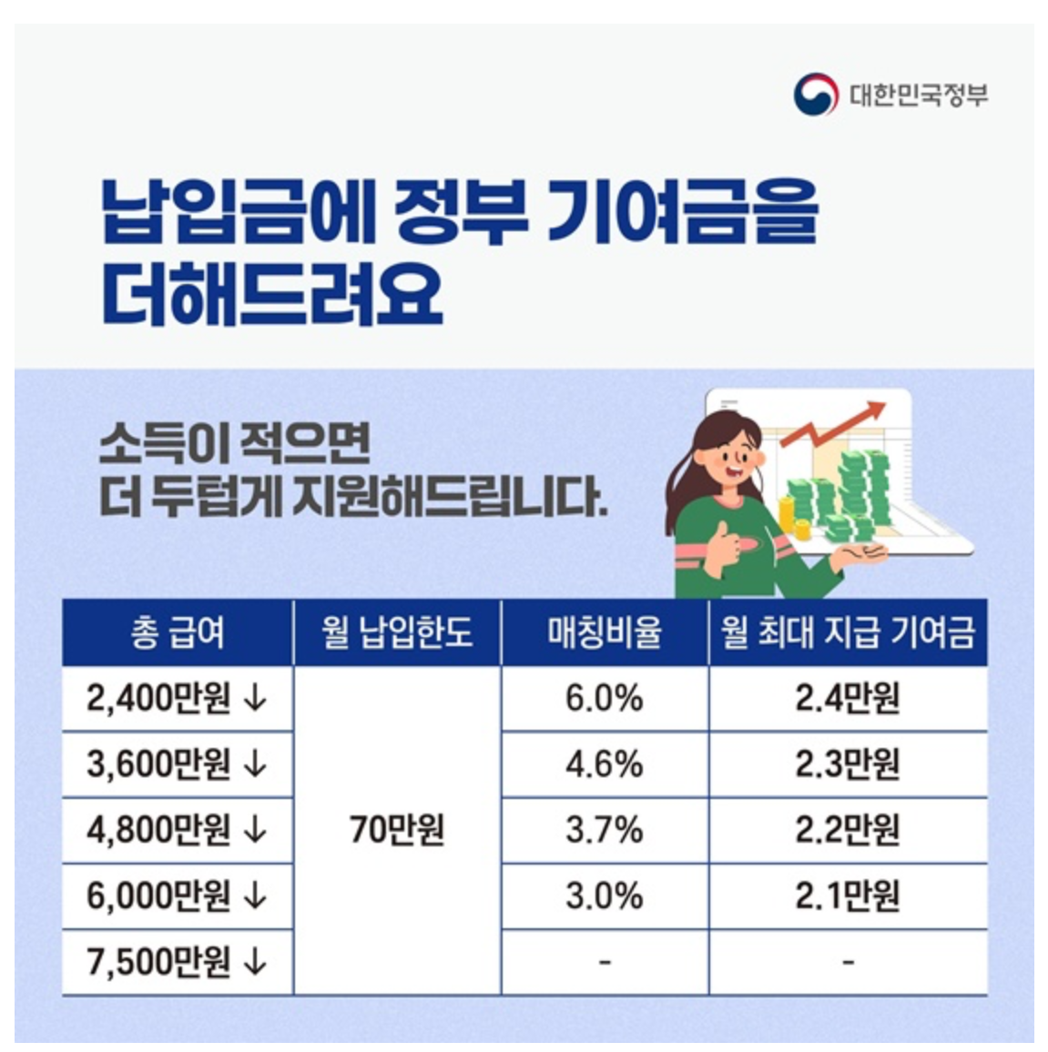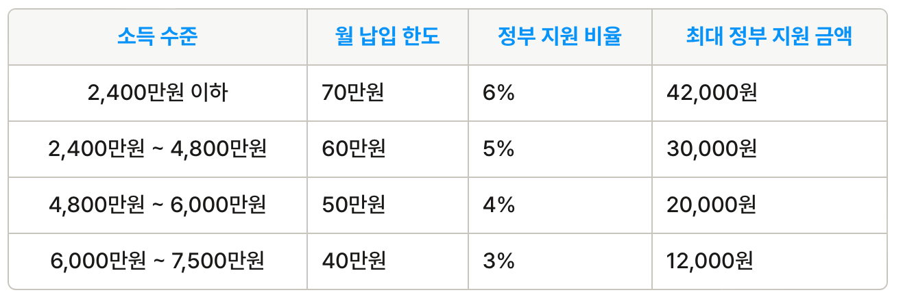 <소득 수준월 납입 한도정부 지원 비율최대 정부 지원 금액>