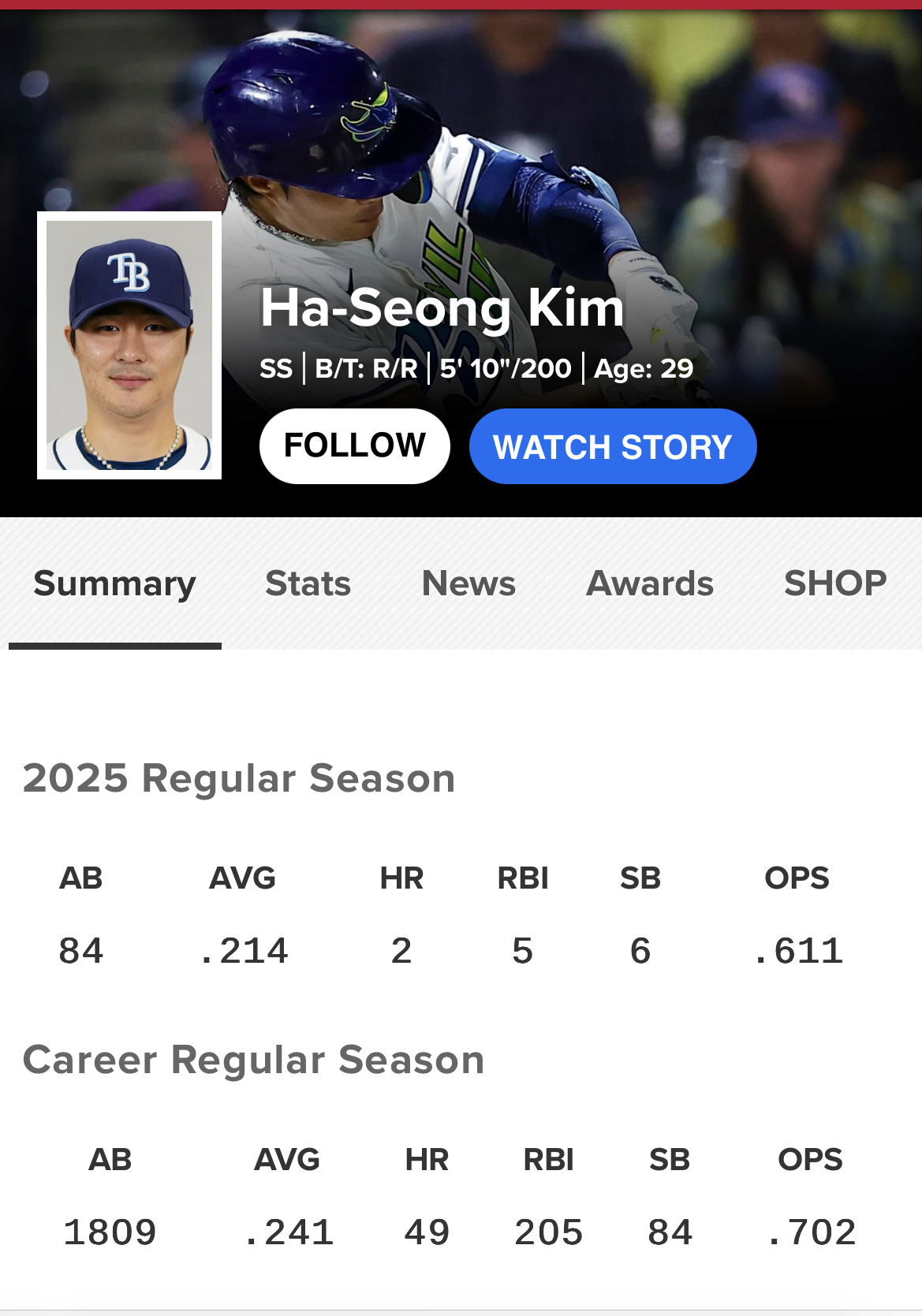 올해 템파베이 레이스와 2년 3,100만 달러로 구단 역사상 최대 규모의 FA계약을 체결했으나, 아쉽게도 부상으로 겨우 24경기에 출전하며 이른바 먹튀 논란이 있었습니다. 결국 템파베이는 김하성을 방출했고, 이에 애틀란타는 웨이버 클레임을 통해 김하성을 영입했습니다.