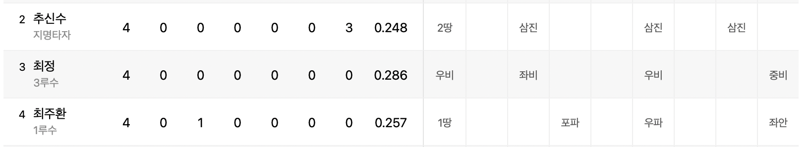 최주환 : 요즘 보면 극단적 끌어치기에 대한 시프트에 계속 걸리는 듯. 이건 본인이 벗어나야 하는데;;