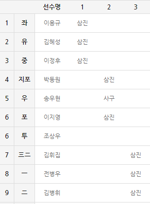 삼진-삼진-삼진 / 삼진-사구-삼진 / 삼진-삼진-삼진 : 3회까지 8삼진
