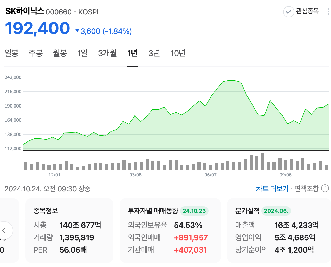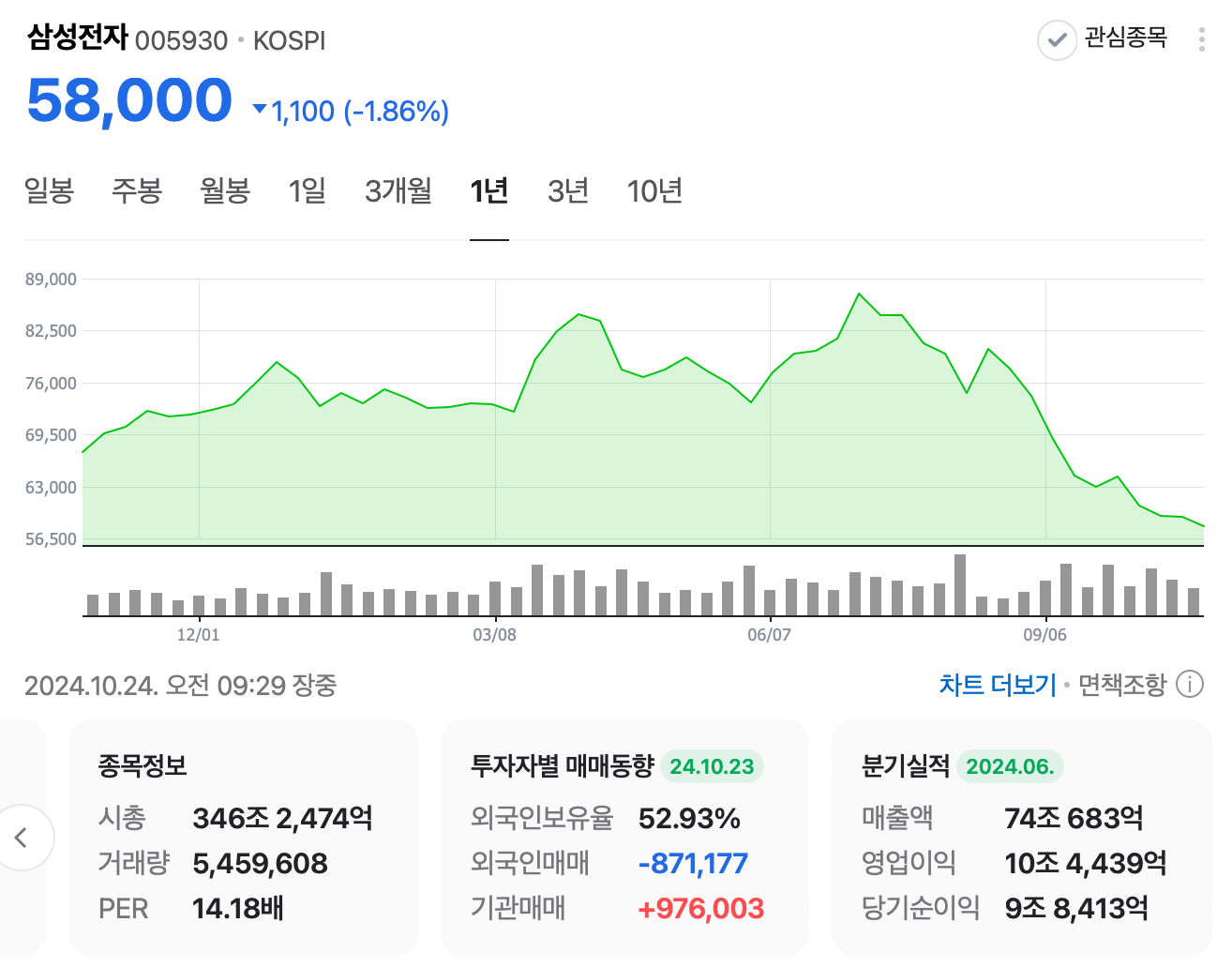 최근 52주 신저가를 기록했습니다. 외국인이 30 거래일 연속으로 순매도를 하고 있으며 무엇보다 메모리 & 반도체 시장에서 주도권을 잃었다고 보고 있네요. 더이상 반도체 분야에서 삼성전자만의 강점이 없어 보이는 이유로 약세를 면치 못하고 있다고 합니다.