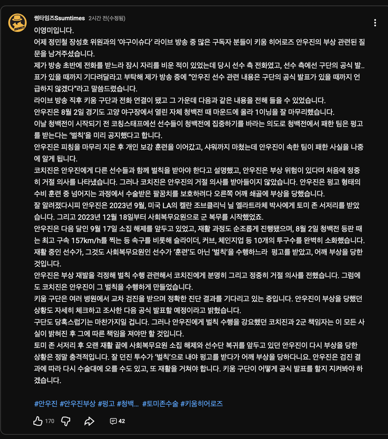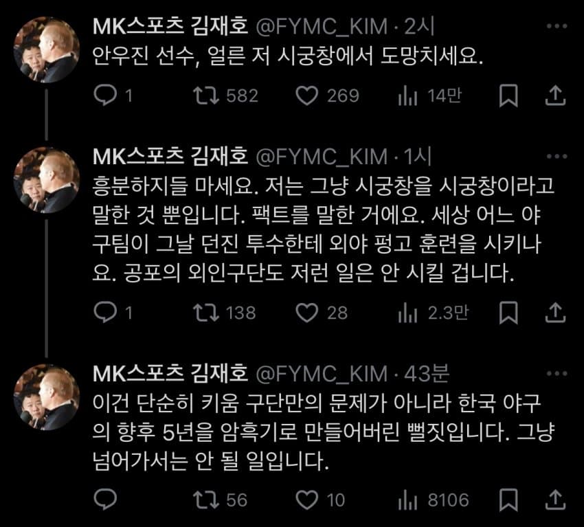 진짜..김성근 감독조차도 투수한테까지도 무리한 펑고를 안시키는데, 하물며 토미존 수술을 받고 회복중인 팀 에이스이자, 사실상 군소속인 선수에게 꼰대 마인드로 대하다니......