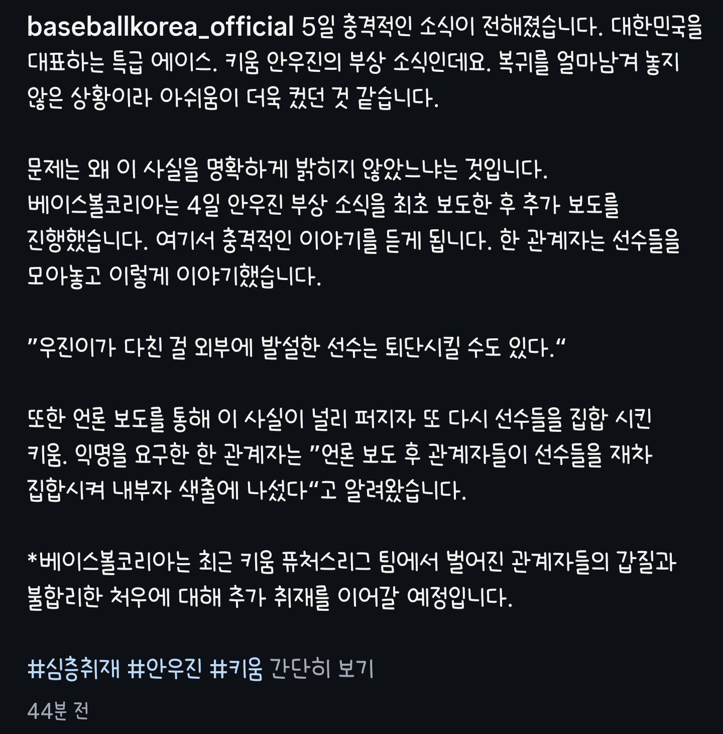 아무리 안우진이 어릴때 문제로 이미지가 안좋다고는 해도. 실력으로 따지면 국가대표급이며, 한팀의 향후 10년을 이끌 수 있는 인재는 분명하다고 봅니다. 팀내 보물처럼 애지중지 다뤄도 모자랄 판에, 부상당한 사실을 발설하면 퇴단조치!!!!!