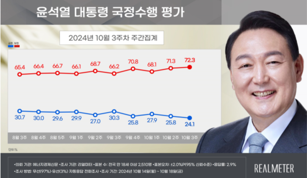 | [속보] 윤대통령 지지율 24%로 역대 최저 경신 (1) | 2024.10.10 |