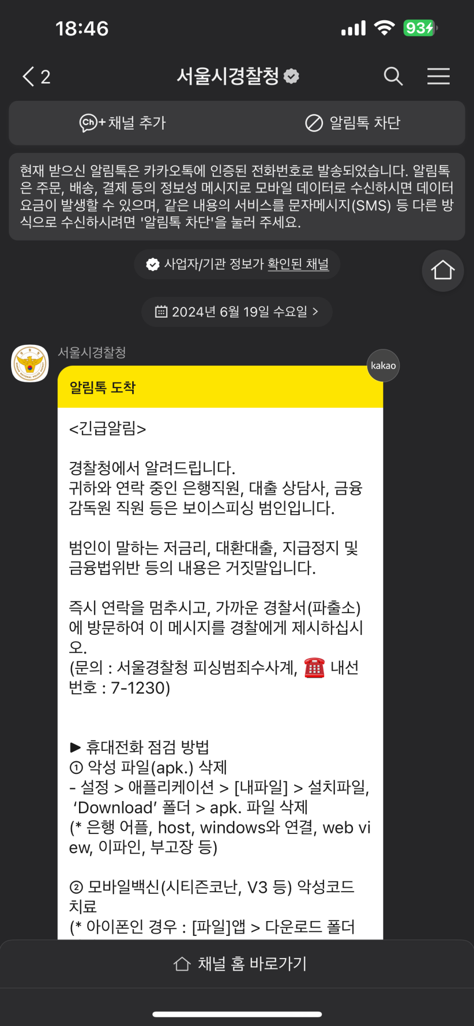 “네네 지금 피싱관련해서 전화를 드렸어요. 현주라는 사람이 보낸 설치파일이 악성파일이고 이것을 설치하시면 문제가 되니 핸드폰을 들고 가까운 파출소로 가셔서 제가 보낸 서울시경찰청 카카오톡을 제시해주세요”