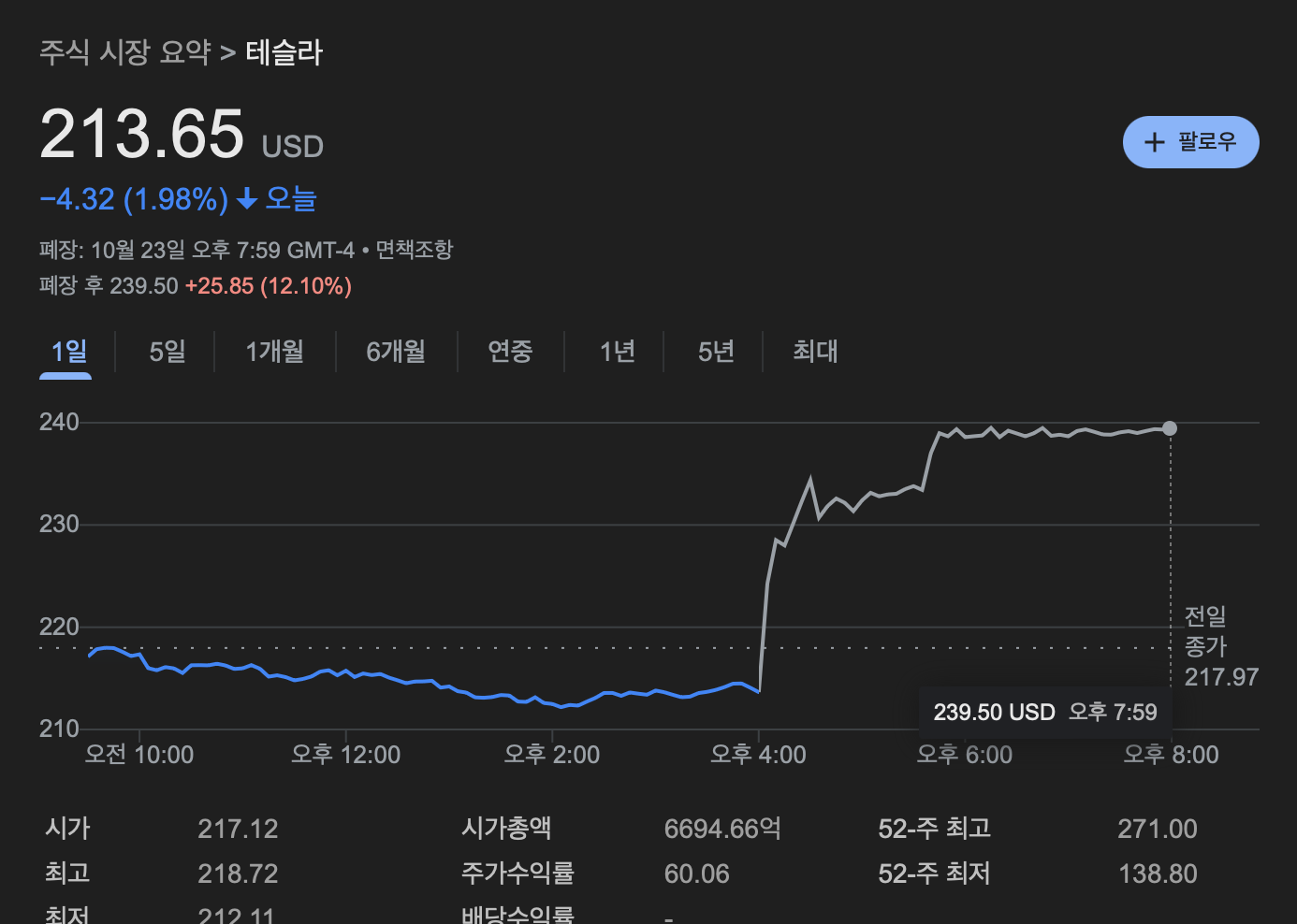 테슬라가 뉴욕증시 시간외거래에서 12.04% 폭등한 239달러를 기록했습니다. 이는 실적발표에서 시장의 예상을 상회하는 실적을 발표했기 때문인데요. 분기매출이 전년대비 8%정도 증가했습니다.
