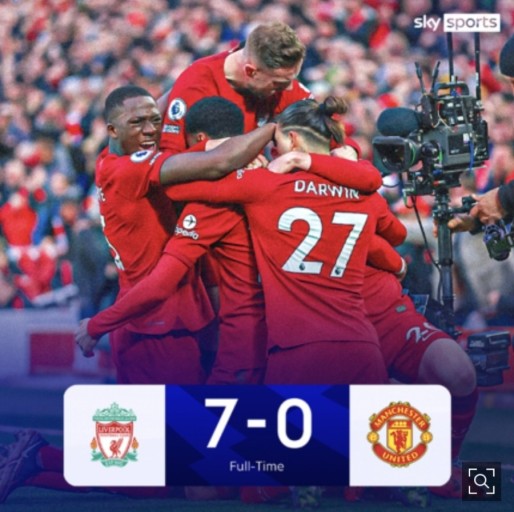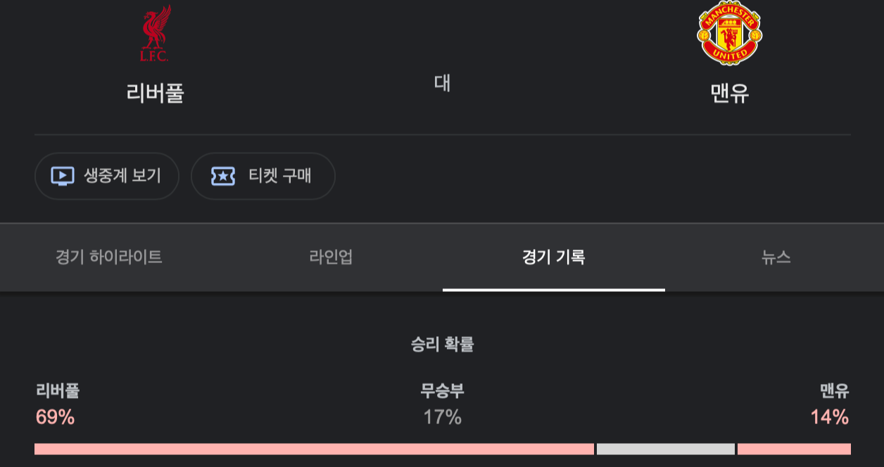 뭐 당연한 결과이겠지만, 두팀의 경기는 압도적으로 리버풀의 우세를 점치고 있습니다. 지난 시즌 마지막 맞대결에서 리버풀은 맨유를 상대로 7-0이라는 큰 스코어 차이로 대승을 거두었기에 이번 경기도 비슷하게 흘러가지 않을까 싶습니다.