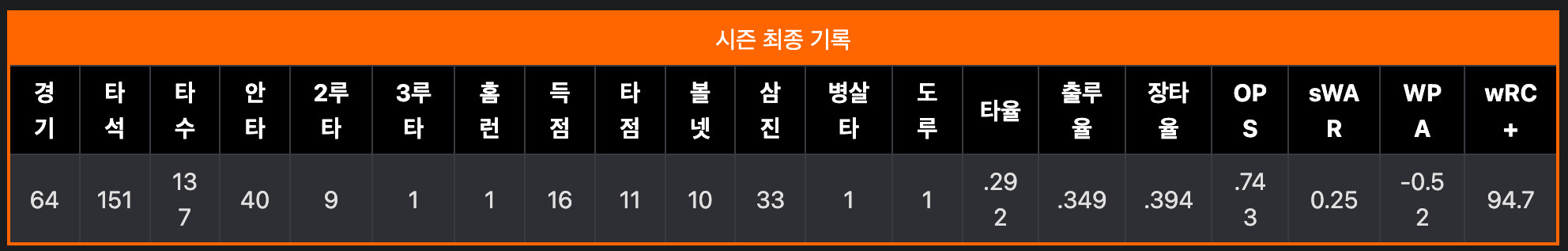 하지만 역시나 부상과 부진으로 64경기 밖에 뛰지 못했고 타율 0.292 40안타 1홈런 11타점을 기록하며 FA로이드란 말이 무색하게 폭망한 시즌이 되었스니다.