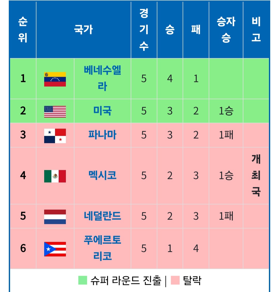 이로써 A조는 파나마에 일격을 맞긴했지만 4승 1패를 기록한 베네수엘라와 미국이 슈퍼 라운드에 진출합니다.