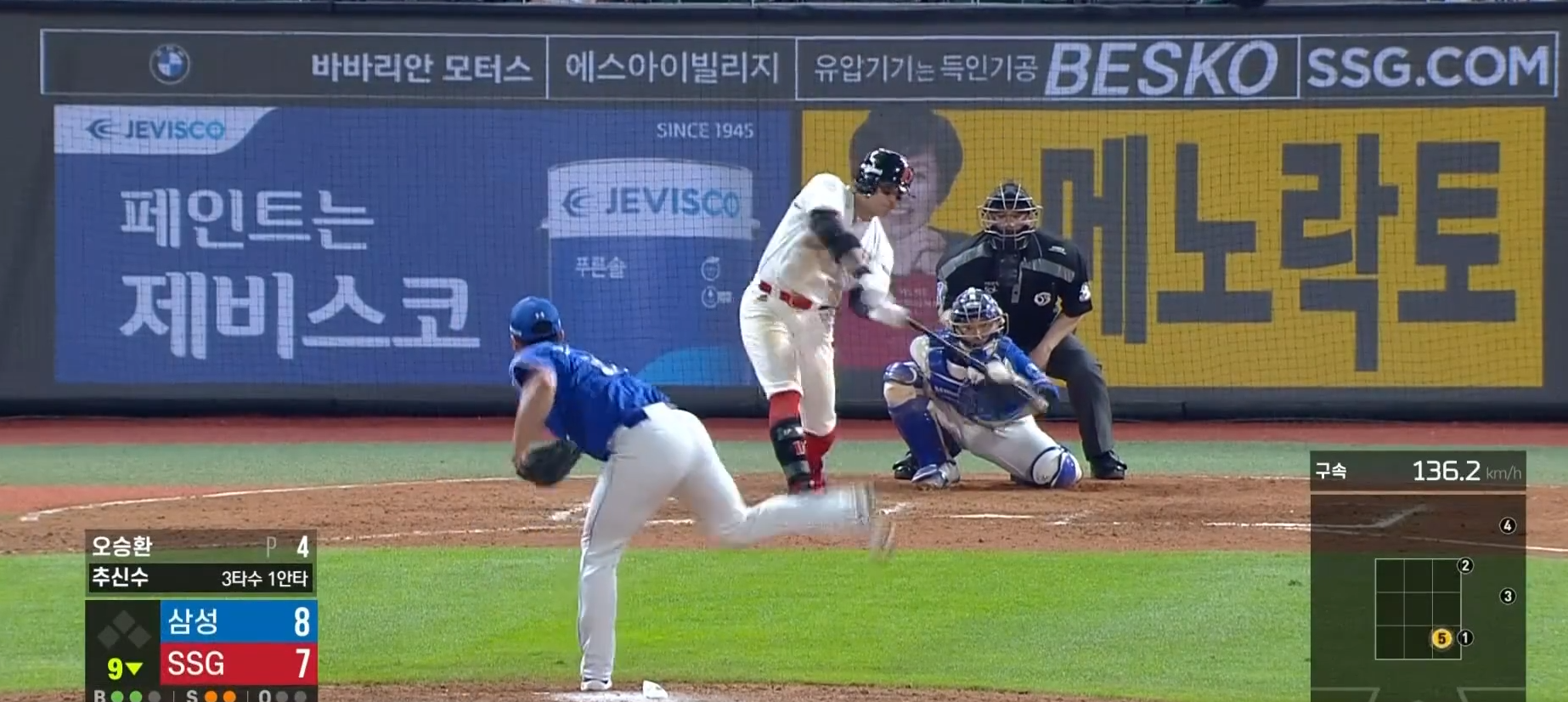 오승환 입장에서는 빠른 공은 잘 공략하는 추신수 상대로 변화구로 대처했다. (5구 연속 바깥쪽)