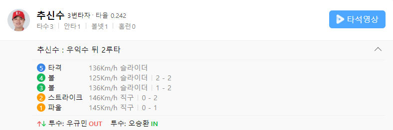 재밌는 점은 145km대의 빠른 직구로 2S를 잡고 3번 연속 슬라이더를 던지다 2루타를 맞았다.