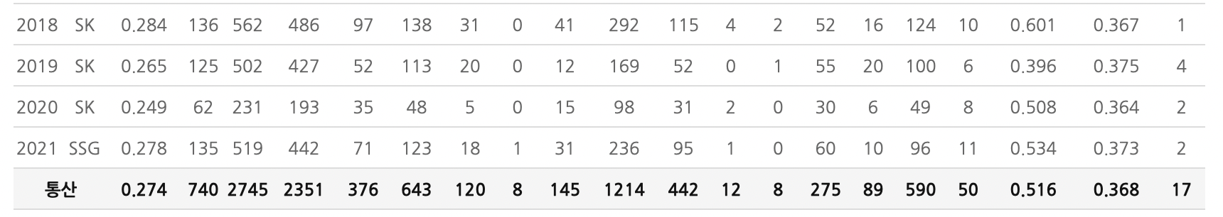 50의 안타 그리고 13개의 홈런 & 40개의 타점을 기록했고 막판까지 SSG가 플옵 싸움을 할 수 있었던 원동력이 되었다.