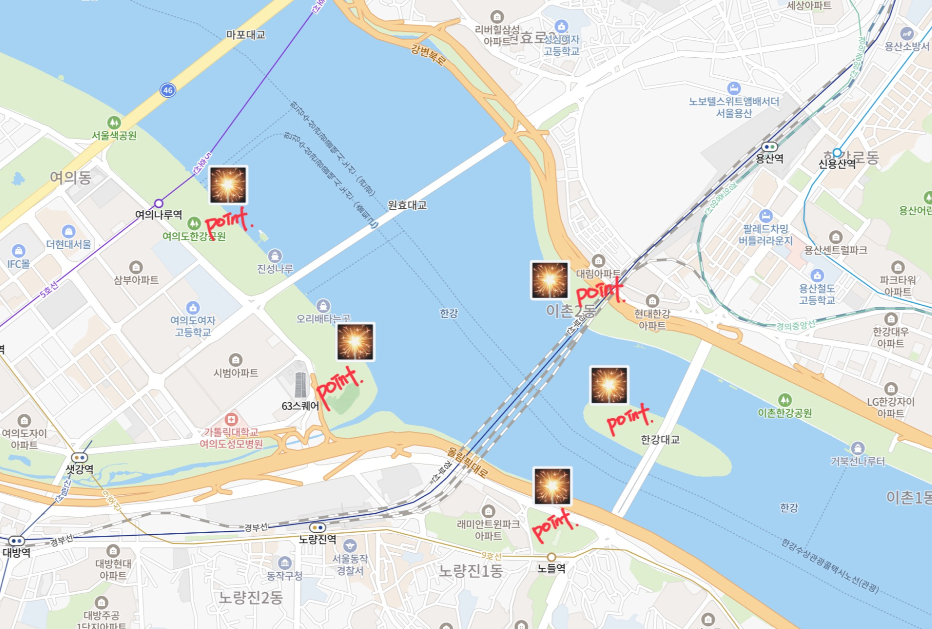 - 여의도 한강공원 63빌딩 앞 : 63빌딩의 멋진 경관과 함께 불꽃놀이를 감상할 수 있는 최적의 장소입니다.