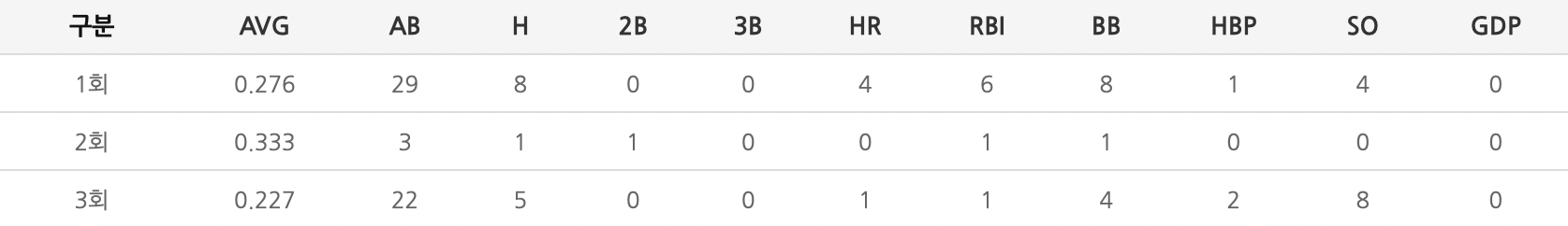 1회 0.286 / 8안타 / 4홈런 / 8개의 볼넷