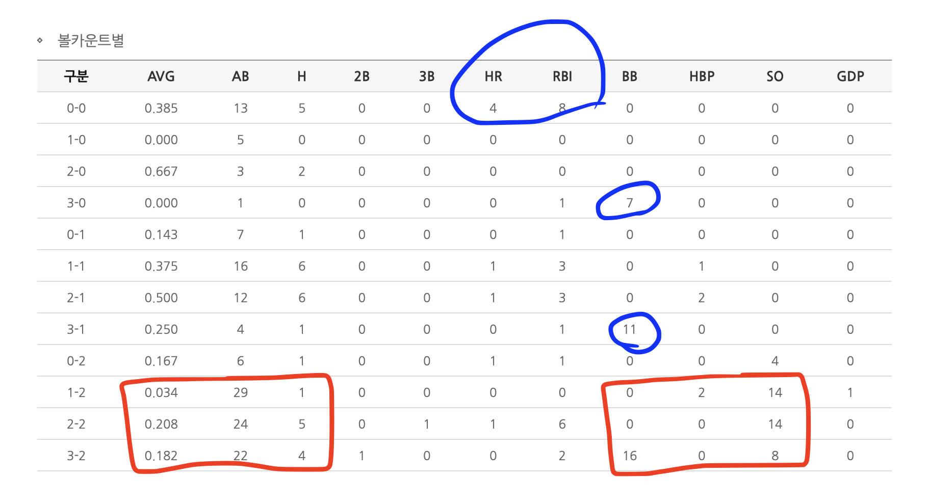 0-3 카운트 상황에서는 8번 기회중 볼넷으로만 7번을 출루했다.