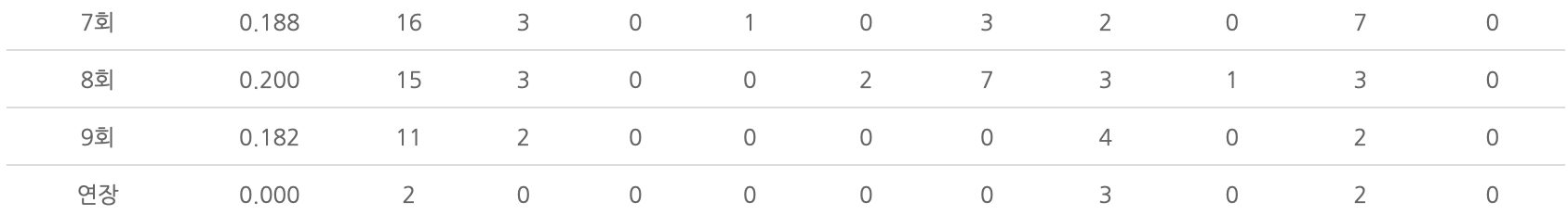 반면에 7회와 9회와 같이 경기 막바지에는 기록이 현저히 떨어진다.