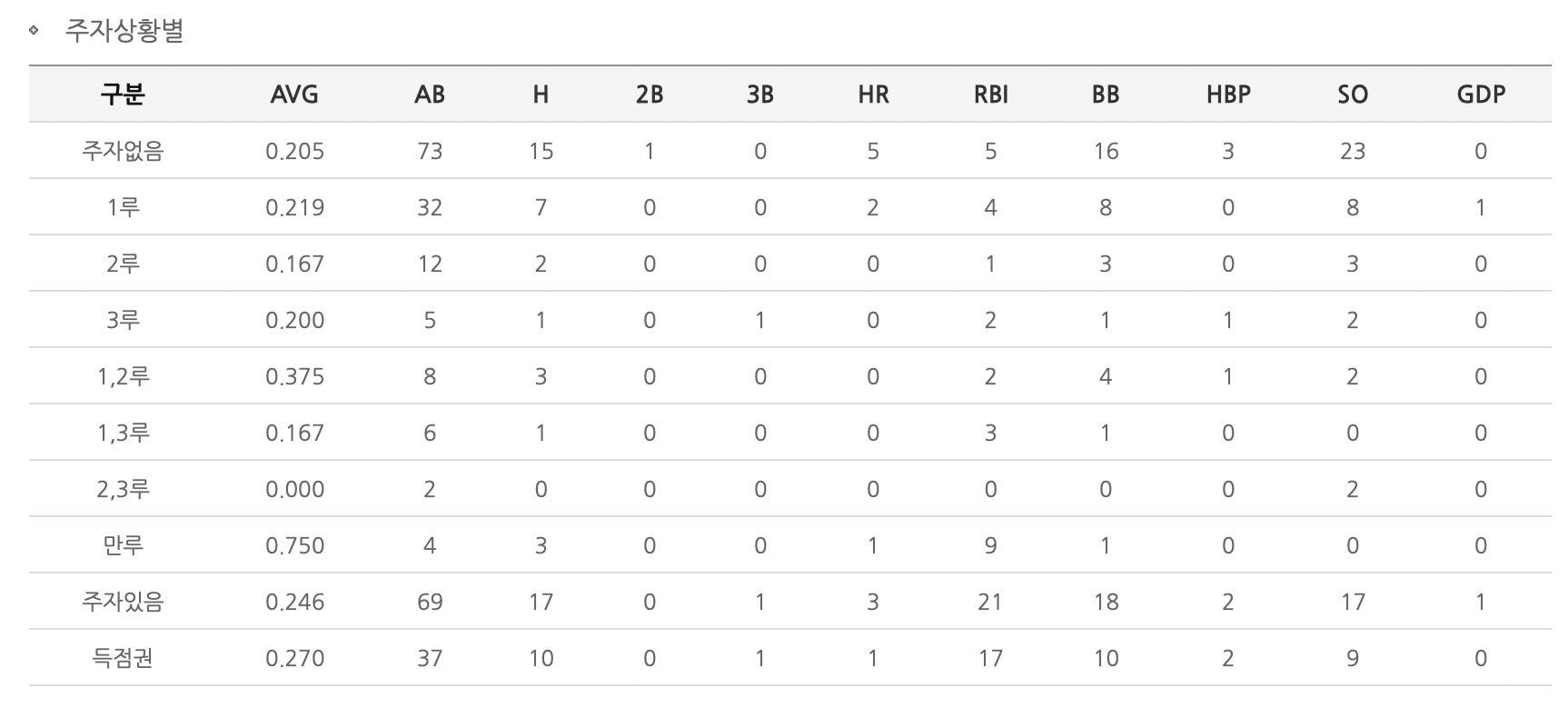 득점권 타율은 0.250으로 36타수 9안타 1홈런을 기록했다.
