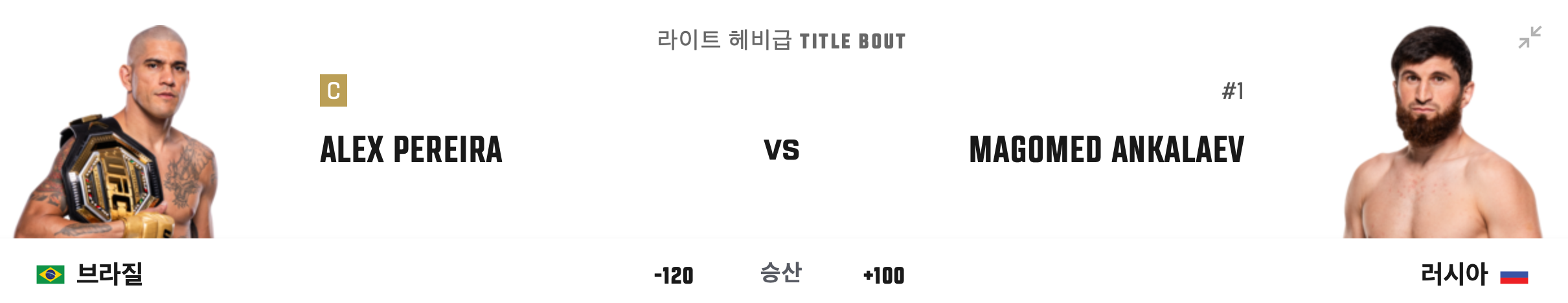 이번 경기는 페레이라(탑독)의 강력한 타격과 안칼라예프(언더독)의 전천후 능력이 맞붙는 흥미로운 대결이 될 것으로 예상됩니다. 페레이라가 타격전에서 우위를 점할 수 있지만, 안칼라예프의 그래플링 능력과 전술적 접근이 변수가 될 수 있습니다.