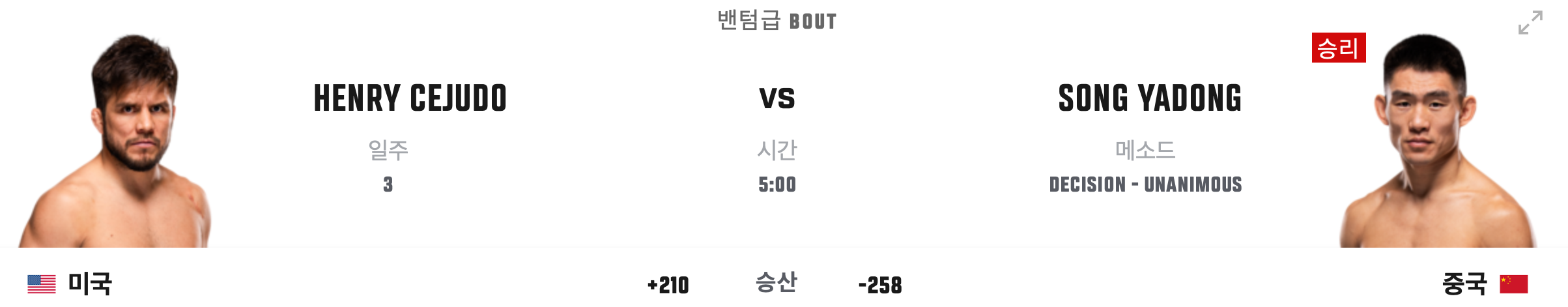 | 2/23 UFC Fight Night 헨리 세후도 vs 송야동 승부예측 (0) | 2025.02.11 |