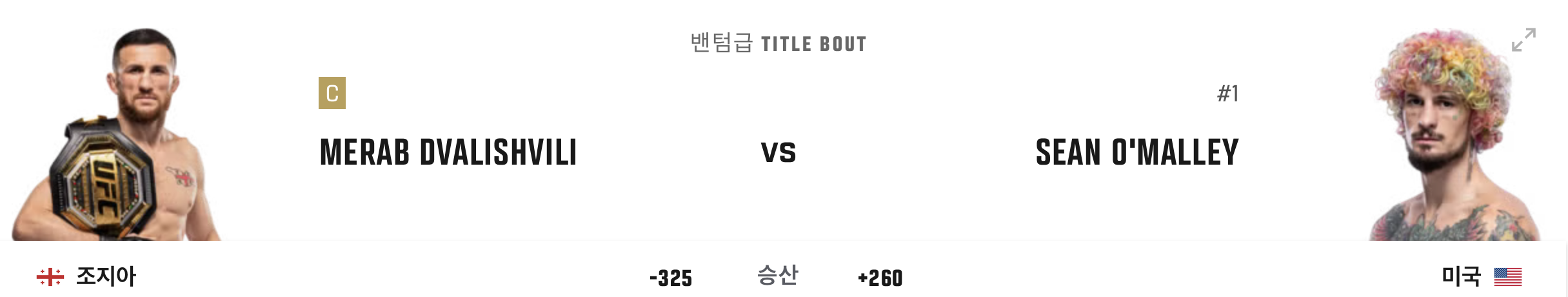 드발리쉬빌리 판정 승 의 가능성이 다소 높다고 봅니다. 드발리쉬빌리의 체력과 압박에서의 우위, 그리고 타이틀 지킨다는 동기 부여가 오말리보다 강할 듯 보입니다. 물론 오말리의 펀치가 초반에 적중한다면 결과가 바뀔 수 있겠지만 그것은 어디까지나 드발리쉬빌리가 방심하지 않는 한 어려울 것으로 보고 있기 때문에 드발리쉬빌리가 이번에도 판정까지 가서 승리를 하지 않을까 합니다.