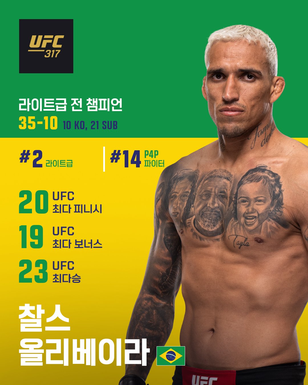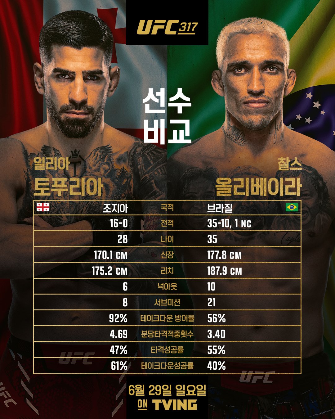 무패로 페더급 챔피언이 되었던 토푸리아는 두체급 석권을 위해 월장을 선택합니다. 라이트급 타이틀전의 상대는 라이트급 강자 찰스 올리베이라였습니다. 두 선수는 시합을 앞둔 전날까지 서로에게 존중을 표현했지만 인터뷰에서는 날선 말들을 서로에게 던지며 절대 굽히지 않았습니다.